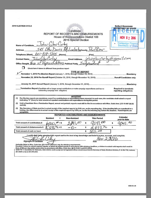 Political newcomer Greg Holcomb, has also failed to submit his campaign finance reports. Although he's a newbie, he's also an attorney and as such, he knows the importance of submitting reports in a timely fashion but his vast knowledge of the law is probably one of the reasons why he didn't submit his campaign finance report. Let me explain. Holcomb will not file his report until after the election so the voters will have NO idea who funded him. As an attorney, Holcomb knows how to finagle the law and use it to his advantage. The campaign finance reports were due on November 1, 2016. At 5:00 p.m. on November 3, 2016, the Secretary of State will start preparing a "48 hour late reporters list" and send it to the media. This generally takes two days and I haven't seen any reports on the news about the candidates that have failed to file their campaign finance reports. After 10 days, or November 11, 2016, the Secretary of State will send a notice to the candidates saying they are 10 days late and owe $50 a day civil penalty. If they pay that within 10 more days and file that they have not violated campaign finance laws, they get to stay on the ballot, encourage people to vote for them and hide the names of their sponsors until after the election. Ask yourself, why would an attorney, who knows the importance of filing papers on time, want to hid the names of those sponsoring his campaign? Where's the transparency? In case you were wondering, the information I've provided regarding campaign finance law is on page 22 of the 2014 Secretary of State Campaign Finance Law and is outlined under § 23-15-813. Civil penalty for failure to file campaign finance disclosure report; notice to candidate of failure to file; assessment of penalty by Secretary of State; hearing; appeal. I know the law but the citizens of Lumberton must pay $1,891 in order for their city clerk to attend a class to learn what I learned by reading. Interesting. But back to Holcomb. What is he hiding? Legally, not ethically, Holcomb will not have to disclose who funded his campaign until after November 21, 2016 but the election is on November 8, 2016.